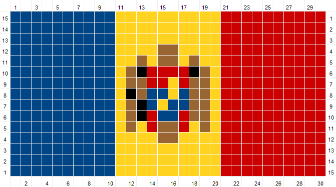 Black parts of the pattern could be replaced with dark green yarn if one is available. With the yarns available to me, I found that black was good in bringing appropriate detail to the coat of arms.